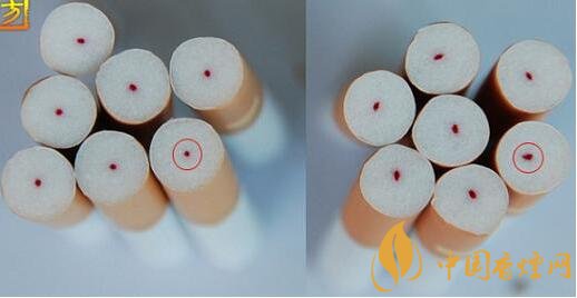 如圖五、圖六紅框標注所示,真煙的HCF過濾纖維(俗稱紅線)位于嘴棒中央,側面呈規(guī)則圓形,假煙則形狀各異參差不齊。有些假煙,中間的紅點是印刷上去的。