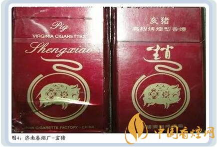 山東濟南卷煙廠曾出品過采用中國民間傳統(tǒng)的剪紙手法設計,底色為紅色的 “亥豬”煙標。圖案上是一頭肥嘟嘟的花豬形象,其短小的四肢似乎支撐不了它的重量,兩只豎立的耳朵和張開的小嘴,表明它正在尋找食物,看上去十分溫馴、可愛。