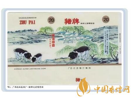 廣西桂林卷煙廠生產(chǎn)過一款豬牌煙標,圖案是三頭花豬正在春風柳綠的村莊外的山地上覓食,包裝上對焦油量、煙氣煙堿量有明確的標識?! ?/p>