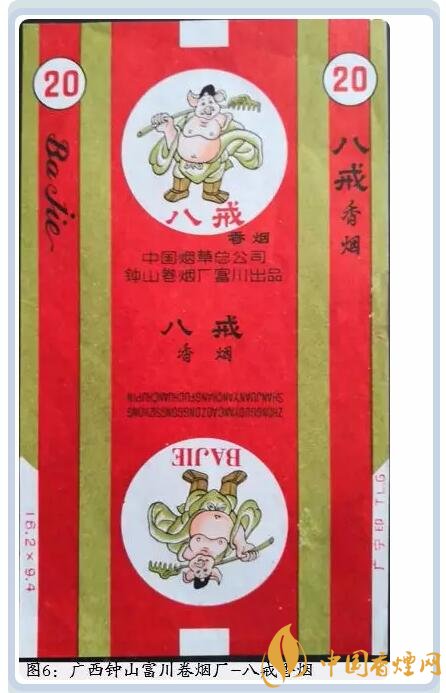 廣西鐘山富川卷煙廠生產(chǎn)過一款八戒香煙,圖案是豬八戒扛著釘耙開懷大笑,其腳下還標有八戒二字。