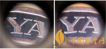 4.YUNYAN拼音字母。真品卷煙金腰帶頂部YUNYAN拼音,筆畫(huà)內(nèi)有橫線(xiàn)條痕跡。該款假冒卷煙字母筆畫(huà)內(nèi)無(wú)橫線(xiàn)條痕跡。圖4左真右假