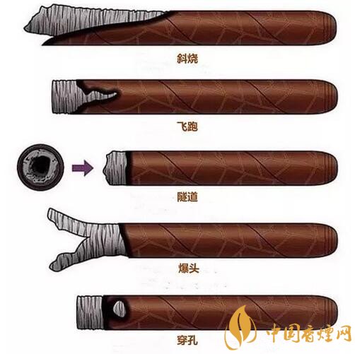 我們抽雪茄的時(shí)候經(jīng)常會(huì)發(fā)現(xiàn)雪茄燃燒出現(xiàn)各種問(wèn)題,這種問(wèn)題我們可以稱作是雪茄的不完美燃燒,雪茄的不完美燃燒是日常抽雪茄經(jīng)常會(huì)遇到的。這張圖就展示了我們抽雪茄中經(jīng)常會(huì)遇到的問(wèn)題。