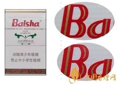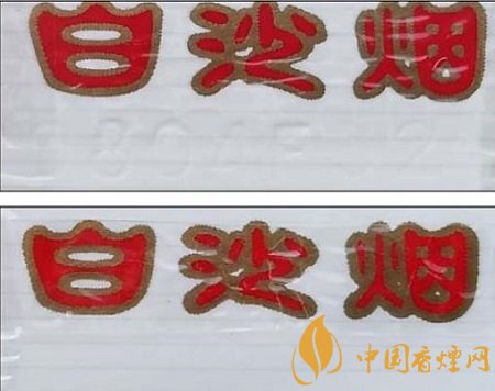 假冒卷煙:背面Baisha拼音字母膠印,紅色與白色交界位置無鋸齒痕跡。