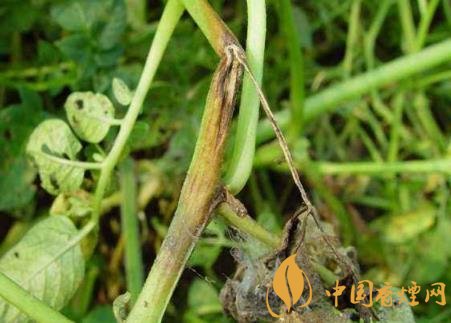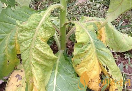 癥狀:煙草青枯病是維管束病害,典型癥狀為枯萎,病株多為一側(cè)枯萎,拔出后可見發(fā)病的一側(cè)支根變黑腐爛,未顯癥的一例根系大部分正常。葉片發(fā)?。撼跗谲浕瑁詾榍嗌?,故稱“青枯病”,隨著細(xì)菌充滿葉脈,兩天后葉脈變黑,葉內(nèi)為黃色網(wǎng)狀病斑。莖發(fā)?。撼霈F(xiàn)長形黑色條斑,有的條斑擴(kuò)展到病株頂部或枯萎的葉柄上。到發(fā)病中后期,全部葉片萎蔫,條斑表皮變黑腐爛,病株莖和葉脈導(dǎo)管變黑,根部也變黑腐爛,甚至莖髓部呈蜂窩狀或全部腐爛形成空腔,僅留木質(zhì)部。橫剖病莖用力擠壓切口,從導(dǎo)管溢出黃白色菌膿。