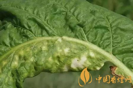 癥狀:幼嫩葉片發(fā)病:病葉直立;較大葉片發(fā)?。撼跗谛纬牲S色圓斑,后病斑中間下陷,背面產(chǎn)生灰色或藍(lán)色霉層,嚴(yán)重時病斑融合成褐色壞死大斑,病葉皺縮扭曲。常表現(xiàn)系統(tǒng)感染,煙株矮化凋萎。在花、蒴果上也出現(xiàn)病斑。