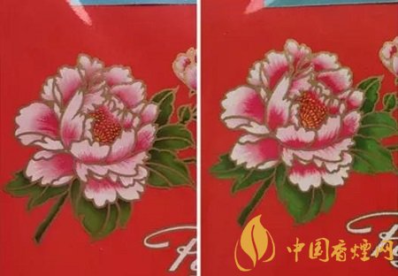 真品卷煙商標紙上的牡丹花瓣的粉紅色采用漸變技術,顏色由深逐漸到淺,自然協(xié)調,立體感強;假煙采用普通仿制技術,粉紅色部分集中于一角,顏色搭配較為死板,立體感差。
