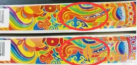 如下圖標示,此處圖案真煙的色彩藍色下邊是過渡的淡藍色,假煙無過渡色直接變成綠色;真煙中間為藍色,假煙全都是綠色;圖右側(cè)四個標注處相同,真煙為藍色的三個圓珠,假煙為綠色的三個圓珠。(上假下真)