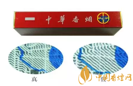 “中華”原產(chǎn)地標(biāo)志為藍(lán)色橢圓形,折光可見“中華”字樣、8顆“★”及天安門圖案。真煙色彩飽滿,圖案清晰;假煙色彩暗淡,圖案模糊。同時還可以借助圖中藍(lán)色線的走勢來區(qū)分真假煙。