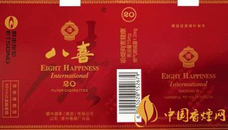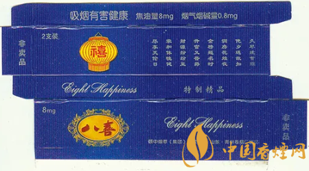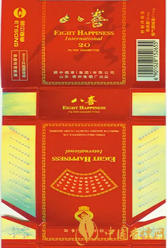 “八喜”香煙高貴典雅的煙標裝潢設計,曾獲得第八屆華東裝潢設計大獎展最佳創(chuàng)意獎。“八喜”香煙問世后,青州卷煙廠得知人們很想知道“八喜”具體指哪“八喜”,于是該廠于1999年向社會廣泛征集吉祥語,從中精選出“久旱逢甘霖、他鄉(xiāng)遇故知、洞房花燭夜、金榜題名時、升官又晉爵、財源紛紛至、家和體魄健、盡享天倫日”等八句具有代表性的吉祥語,作為“八喜”的詮釋和具體所指。
