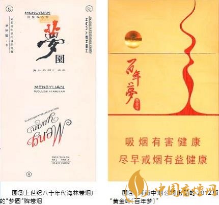 如新邵卷煙廠的“夢(mèng)”(見(jiàn)圖①),菏澤卷煙廠的“金夢(mèng)”(見(jiàn)圖②),貴定、海林卷煙廠的“夢(mèng)圓”(見(jiàn)圖③),興義卷煙廠的“夢(mèng)歸”,許昌卷煙廠的“夢(mèng)幻”,安陽(yáng)、當(dāng)陽(yáng)卷煙廠的“藍(lán)夢(mèng)”,蓬安卷煙廠的“藍(lán)的夢(mèng)”,綿陽(yáng)卷煙廠的“九寨溝夢(mèng)幻”,阜陽(yáng)卷煙廠的“東方夢(mèng)”,銅仁卷煙廠的“夢(mèng)中情”,太原卷煙廠的“夢(mèng)佳麗”,紅安卷煙廠的“夢(mèng)之花”,四平卷煙廠的“夢(mèng)妮”,鳳凰卷煙廠乾州分廠“夢(mèng)斯”等。另一類(lèi)是取材于古代文學(xué)作品和傳說(shuō)。如南京卷煙廠的“夢(mèng)都”,新晃卷煙廠的“紅樓夢(mèng)”,鐘山卷煙廠的“夢(mèng)”,廣水卷煙廠的“黃粱夢(mèng)”,長(zhǎng)春卷煙廠的“夢(mèng)仙草”,許昌卷煙廠的“夢(mèng)蝶”等。