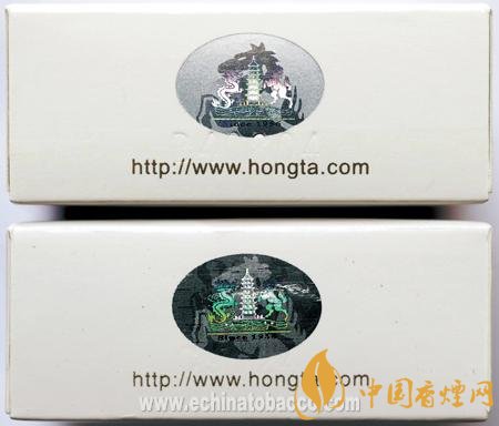 背面商標(biāo)紙印刷工藝差異對(duì)比:真品商標(biāo)紙采用白卡紙,凹印印刷,“Hongtashan”字體用手摸沒有凹凸感,“紅塔”左邊上下兩朵云距離塔身較遠(yuǎn);假煙采用高清掃描仿制印刷,“Hongtashan”字體用手摸有凹凸感,“紅塔”左邊上下兩朵云離塔較近,與真品特征存在明顯差異。