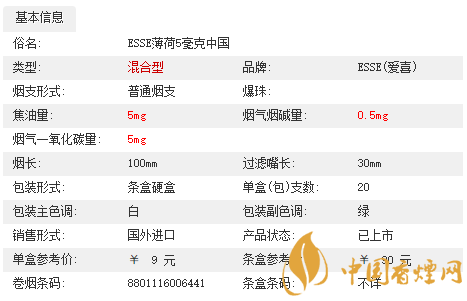 ESSE是韓國產(chǎn)的一種女式香煙,它的中文名為愛喜 。這個煙是韓國煙草人參公社出品,它的全稱為ESSE Menthol,也叫愛易,愛惜。它有粉色普通型、藍(lán)色特醇型和綠色薄荷型,是極有女人緣的韓國煙,薄荷味入口清涼,比較經(jīng)典的涼煙。