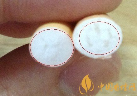 細(xì)看煙嘴角顏色,左邊黃色較右邊顯得較深,光憑這點(diǎn)可能會(huì)受光線的影響,用力揉搓煙嘴,就會(huì)發(fā)現(xiàn)右邊假煙部分濾嘴基本已經(jīng)散架,中間已經(jīng)變成了空心。而且黃色的紙也有所破損。而左邊的真煙嘴完好無損。只有些許揉捏痕跡。
