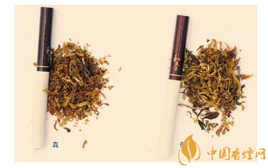 四、煙支過濾嘴及煙絲差異對(duì)比:真煙煙支采用復(fù)合濾嘴,煙絲切絲寬度均勻,煙絲疏松、光澤油潤性好、呈檸檬黃色,煙絲結(jié)構(gòu)為葉絲和少量膨脹梗絲;假煙煙支采用普通濾嘴,制絲工藝簡單,煙絲寬度不均勻,有少量梗絲,未經(jīng)過膨脹處理。