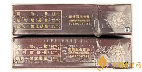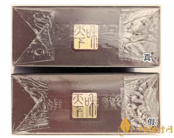 一、正面商標(biāo)紙印刷工藝差異對(duì)比:真煙商標(biāo)紙采用復(fù)合鐳射銀卡紙,膠印和絲網(wǎng)印刷,“和天下”字體采用壓凸?fàn)C金工藝,用手摸凹凸感較明顯,且字體筆畫較粗,商標(biāo)紙上字體、拼音、花紋看上去有較清晰的豎線;假煙一般為高清掃描仿制印刷,“和天下”字體用手摸凹凸感不明顯,且字體筆畫較細(xì),商標(biāo)紙上拼音、花紋等處豎線較模糊。