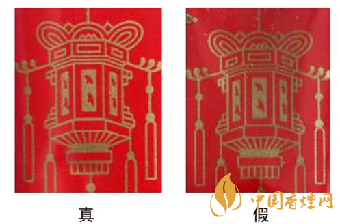 小盒側(cè)面燈籠圖案的印刷對(duì)比:真煙的三個(gè)小方格中,下面那個(gè)方格的最下面那一橫為水平的;假煙下面那個(gè)方格的最下面一橫非水平,呈一定角度傾斜。