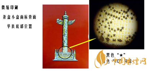 5.用放大鏡查看條盒小盒商標背面華表底部位置,可以看到黑色“★”、黃色“YC”字母。
