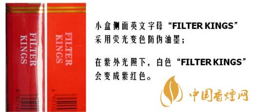 2.小盒:光變防偽涂層——小包側面“FILTER KINGS”字樣,經陽光直射或紫外光照射后由白色變成紫紅色,停止照射后,紫紅色會逐漸消退。