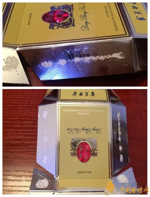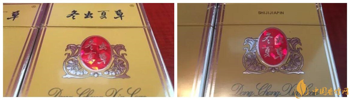 冬蟲(chóng)夏草煙真假鑒別小盒頂部特征;左邊為正品,有裝飾花紋,而右邊的仿品不具備此特征。