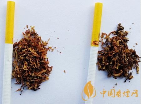 煙支及煙絲差異對(duì)比:真煙煙支黃色接裝紙長(zhǎng)度為30mm,煙絲切絲寬度均勻,煙絲疏松、光澤油潤(rùn)性好,呈檸檬黃色,煙絲結(jié)構(gòu)為葉絲和少量造紙法再造煙葉;假煙煙支黃色接裝紙較長(zhǎng)為32mm,煙絲切絲寬度不勻,光澤油潤(rùn)性較差,煙絲結(jié)構(gòu)為葉絲和膨脹梗絲,與真品特征存在明顯差異。