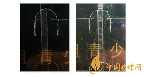 真品卷煙:條盒兩端透明紙上隱約可見卷煙包裝機(jī)烙鐵留下的燙封痕跡;底部透明中間位置紙收縮平整、緊實(shí),兩側(cè)透明紙收縮自然;鋼印隱約可見力度大小不同,不清晰。