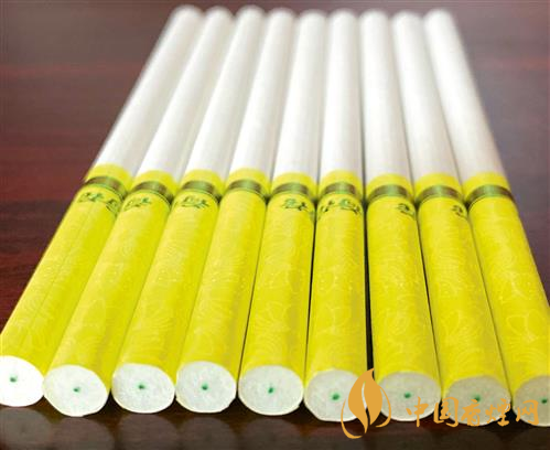 觀察煙支。真品煙支長(zhǎng)度為97mm,接裝紙長(zhǎng)度為36mm,嘴棒長(zhǎng)度為30mm。接裝紙為黃綠色,帶燙金“荷花”字樣及整圈燙金花紋,使用專(zhuān)版小方格卷煙紙,內(nèi)置加香亮鮮綠線醋酸濾棒,煙支端口平齊無(wú)毛茬。
