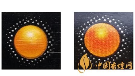 真品卷煙:小盒正面橙色珠子圓潤(rùn)、飽滿,中間凸起,立體感強(qiáng),中間有高光亮點(diǎn)。